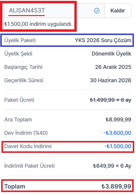 Kunduz’da Dönemlik ve Full Eğitim-Soru Çözüm paketlerinde geçerli%38 e varan davet kodu indirimini kaçırma! Hem de 3 taksit peşin fiyatına!